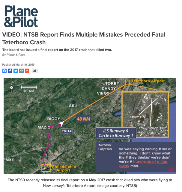 It continued, “Reading the cockpit voice recorder (CVR) transcript released by the NTSB detailed the final 30 minutes of the flight from Philadelphia International Airport (PHL) to TEB that could at best be described as confusing, with a captain pushing the SIC along when that pilot was clearly not prepared to fly the Learjet in the busy New York airspace.”