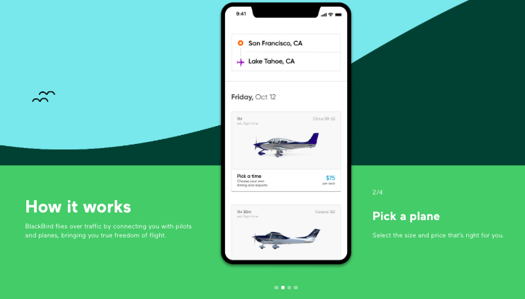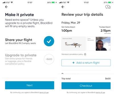 No matter your style, BlackBird can help. Fly on your own terms by creating a flight, or book a seat on a plane already flying for the ultimate flight-sharing experience.”