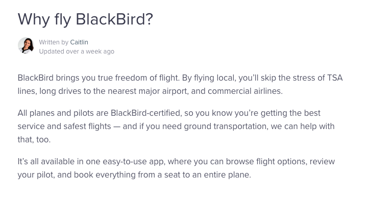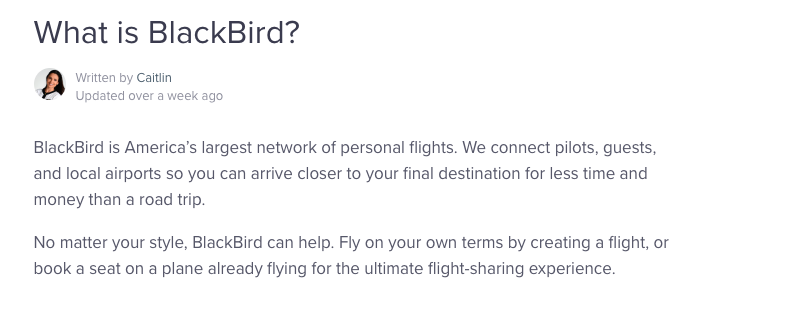 The answer was, “BlackBird is America’s largest network of personal flights. We connect pilots, guests, and local airports so you can arrive closer to your final destination for less time and money than a road trip.