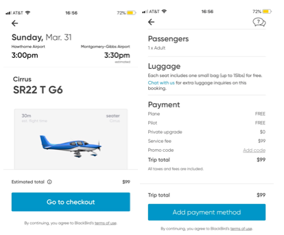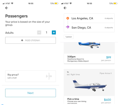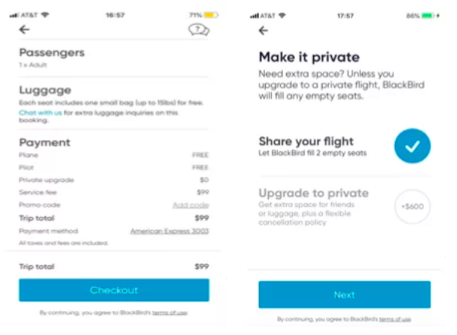 After downloading the Blackbird app, I did find it easy to use. There were cheap flights. I could schedule my own flights picking the time and aircraft. It allowed me to choose the entire airplane for myself. I could also save money by just buying the seats I needed and letting Blackbird fill the rest. Scanning the app, I found flights already scheduled where I would pay just for a seat. It was quick.