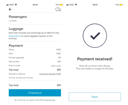 BlackBird states members are paying “platform fees” to join flights scheduled by other members. My $99 was charged as a “Service Fee” (below left). It states the pilot and plane were “Free” on the payment page.