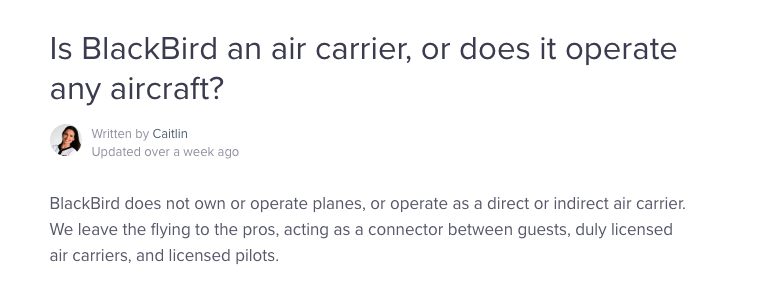 The answer, “BlackBird does not own or operate planes, or operate as a direct or indirect air carrier. We leave the flying to the pros, acting as a connector between guests, duly licensed air carriers, and licensed pilots.”