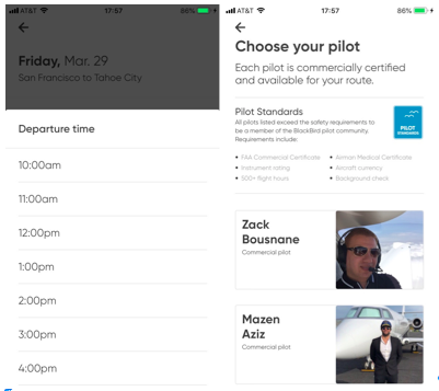 All planes and pilots are BlackBird-certified, so you know you’re getting the best service and safest flights — and if you need ground transportation, we can help with that, too. It’s all available in one easy-to-use app, where you can browse flight options, review your pilot, and book everything from a seat to an entire plane.”