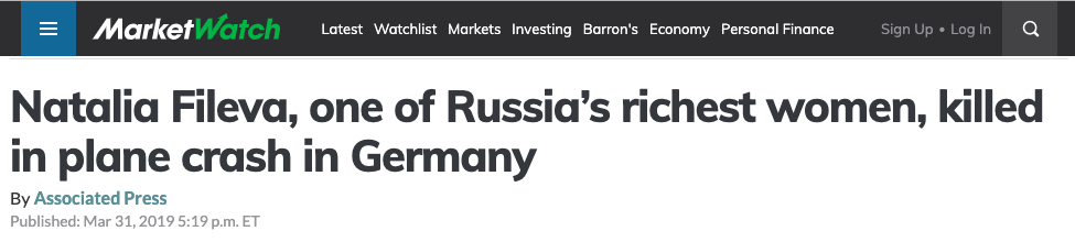 Sunday, Natalia Fileva, ranked as the fourth richest women in Russia by Forbes, died as the six-seat single engine Epic LT she was aboard crashed while making its approach to a business aviation airport near Frankfurt, Germany.
