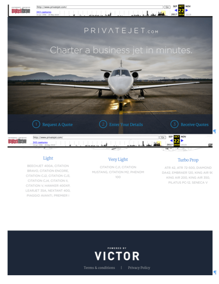 Jay Farrow, the attorney for Don’t Look told Private Jet Card Comparisons although the privatejet.com now redirects to flyvictor.com, the original agreement was that Victor would build out and maintain the site, complying government regulations.