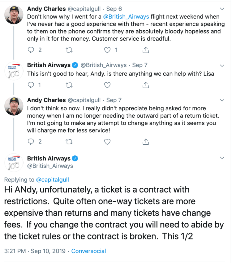 From its Twitter account pictured below, BA responded, “Hi Andy, unfortunately, a ticket is a contract with restrictions. Quite often one-way tickets are more expensive than returns and many tickets have change fees. If you change the contract you will need to abide by the ticket rules or the contract is broken…if an outbound flight is not traveled on then the return flight is forfeit and canceled.”