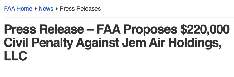 It continued, “On the same day, and prior to expiration of the 30 day time period afforded to respond to the allegations, the FAA issued a press release disclosing the allegations and proposed civil penalty against JEM Air, which are unsupported by fact and law.”