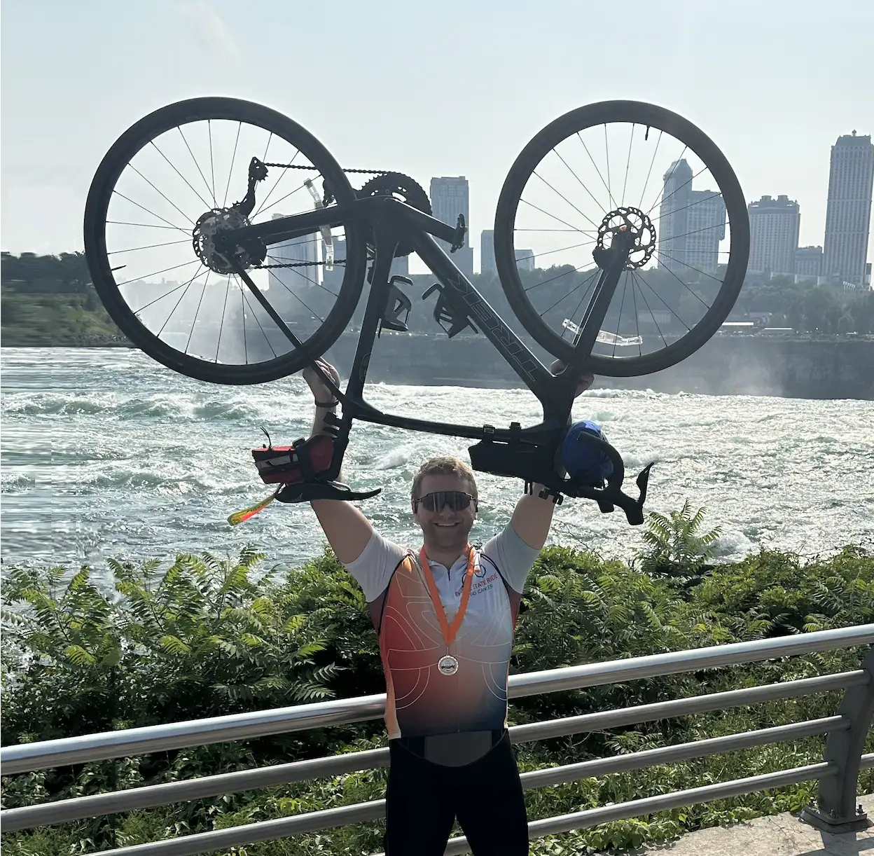 Kane Lewandowski is pictured above after completing a 550-mile bike ride for charity.